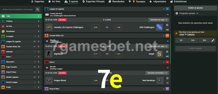 O 7e oferece uma grande seleção de opções de apostas em e-sports com probabilidades competitivas